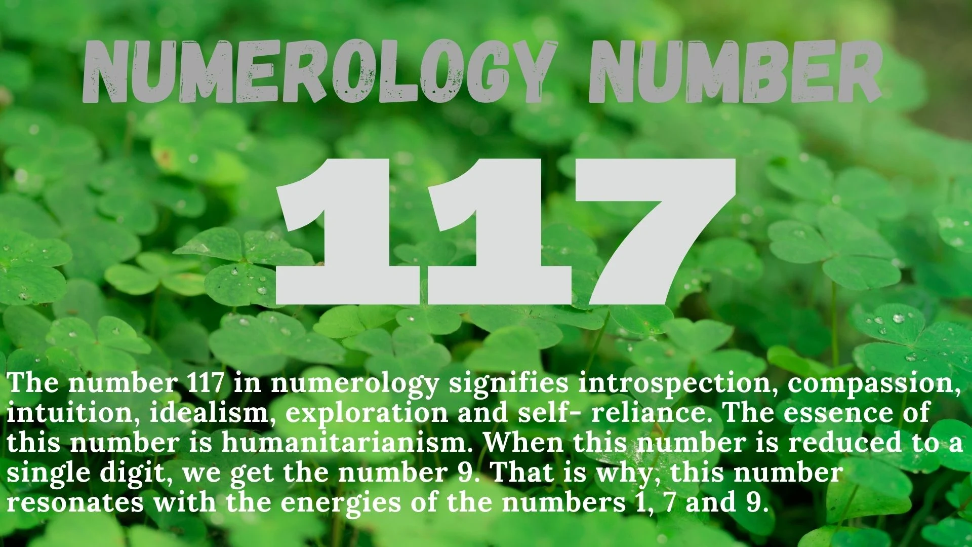The number 117 in numerology signifies introspection, compassion, intuition, idealism, exploration, and self-confidence.The essence of this number is humanitarianism. When this number is reduced to a single digit, we get the number 9.